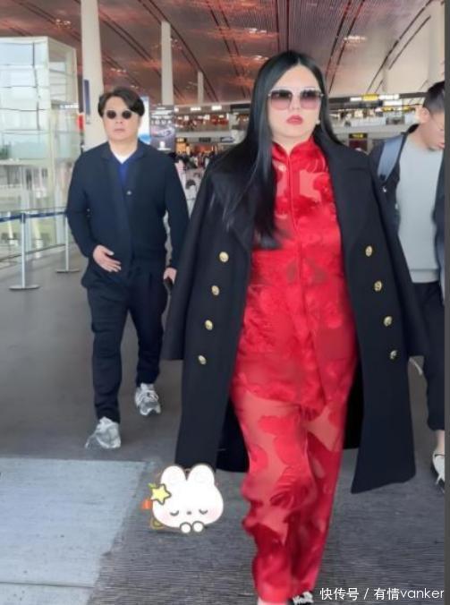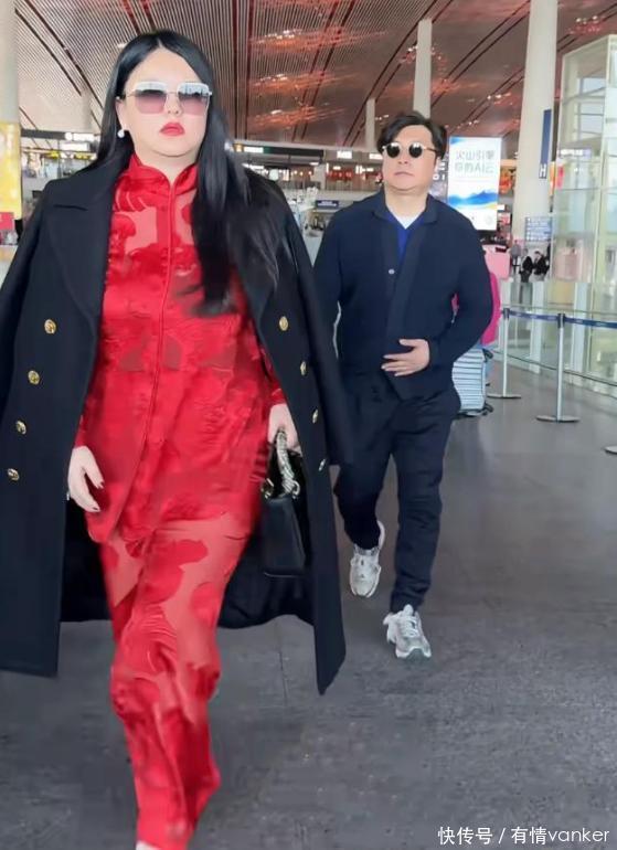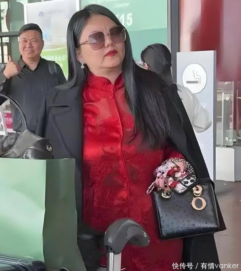 李湘穿着红色中式套装,外面披着一件大衣,拿着高奢包包霸气归来。